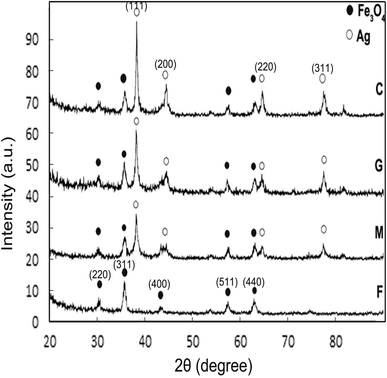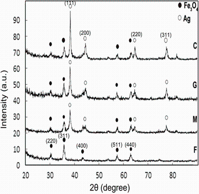Figure 2 (C, G, M and F) illustrates XRD patterns for the pure Fe3O4 and the synthesized bifunctional Fe3O4-AgN(C, G and M). Characteristic peaks were observed at 2θ values of 30.1° , 35.5° , 43.1° , 53.5° , 57.0° and 62.6° , which are approved for pure Fe3O4 and correspond to the (220), (311), (400), (422), (511) and (440) planes of crystalline Fe3O4. XRD patterns for Fe3O4-AgN(G, M, C) illustrate the diffraction peaks of silver (2θ = 38.1° , 44.4° , 64.4° , 77.5° and 81.5° , which correspond to the (111), (200), (220), (311) and (222) planes of cubic Ag) as well as Fe3O4, these being consistent with ICDD PDF2 references (JCPDF No. 01-075-0033 of Fe3O4; JCPDF No. 00-001-1167 and 00-004-0783 of Ag in Fe3O4-AgN(G and C) and Fe3O4-AgNM, respectively) and confirm the coexistence of Fe3O4 and AgN in the bifunctional Fe3O4-AgNs thus obtained [14, 35].