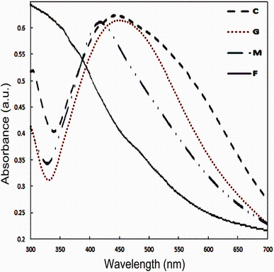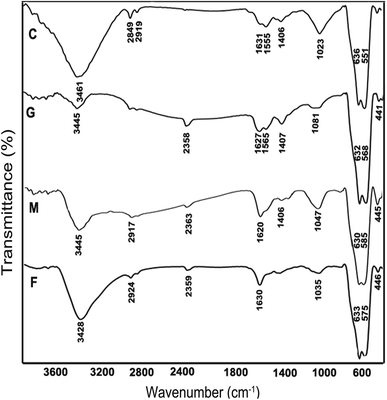 | Fig. 4 FTIR spectra of Fe3O4-AgNC (C), Fe3O4-AgNG (G), Fe3O4-AgNM (M) and Fe3O4 (F) (applying KBr pellets) |