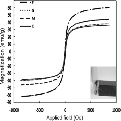 | Fig. 5 Saturation magnetization curves of Fe3O4-AgNC (C), Fe3O4-AgNG (G), Fe3O4-AgNM (M) and Fe3O4 (F) (measured at room temperature) and magnetic field applied to attract Fe3O4-AgNs |