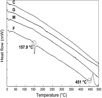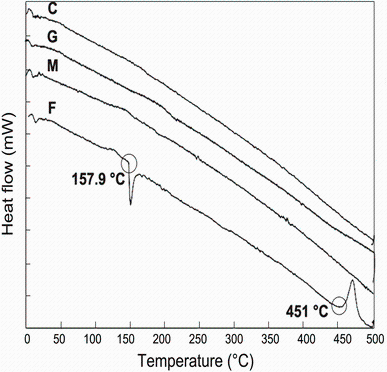 | Fig. 6 DSC curves of Fe3O4-AgNC (C), Fe3O4-AgNG (G), Fe3O4-AgNM (M) and Fe3O4 (F) (Al2O3 as standard) |