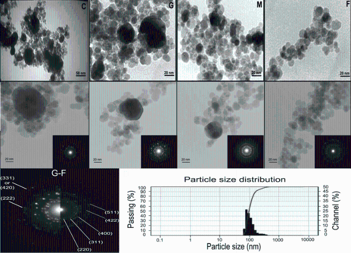 | Fig. 3 TEM images and corresponding SAED patterns of Fe3O4-AgNC (C), Fe3O4-AgNG (G), Fe3O4-AgNM (M) and Fe3O4 (F); compared SAED patterns of Fe3O4-AgNG and Fe3O4 (G-F); DLS analysis of Fe3O4-AgNG(D) |