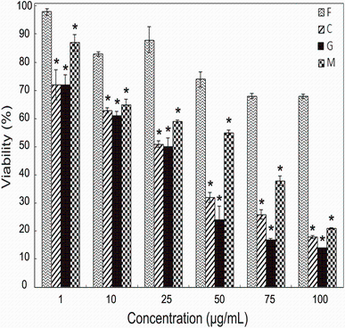 The concentration-dependent manner of toxicity for test Fe3O4-AgNs was confirmed according to cell viability against HepG2 cell line as a result of MTT assay (Fig. 7). The cell viability values thus obtained reflect significant cytotoxic activities for the test Fe3O4-AgNs at concentrations ranging from 1 to 100 μ g/mL (as compared to pure Fe3O4) within 48 h. The exposure to 50 µ g/mL of Fe3O4-AgNG produced a 76% decrease in cell viability, which increased to 86% at the concentration of 100 µ g/mL. The concentrations of 50 μ g/mL and 100 µ g/mL for Fe3O4-AgNC induced 68% and 82% decreases in cell viability, respectively. At concentrations of 1-25 μ g/mL, there was no significant difference between Fe3O4-AgNG and Fe3O4-AgNC.