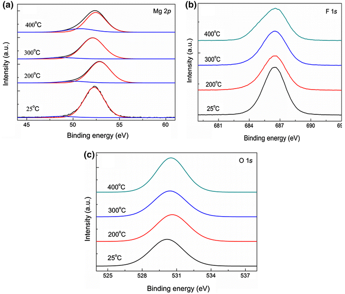 Fig. 2 XPS spectra of MgF2 films annealed at different temperatures: a Mg 2p core-level spectra, b F 1s core-level spectra, c O 1s core-level spectra