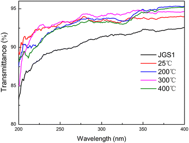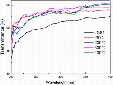 Fig. 3 Transmittance spectra of the bare JGS1 substrate and the substrates with MgF2 films annealed at different temperatures