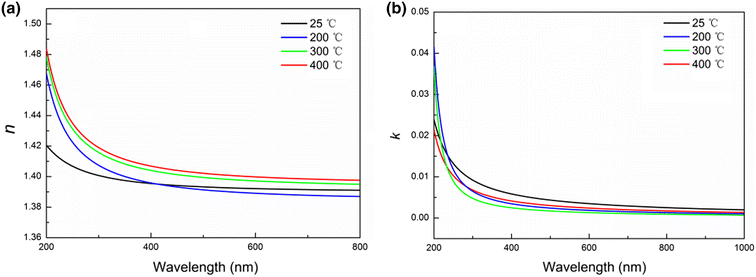 Fig. 4 Refractive index n (a) and extinction coefficient k (b) for the as-deposited and thermal annealed (200-400 °C) thin films determined by spectroscopic ellipsometry