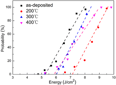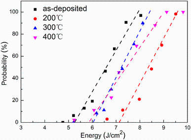The LIDTs of MgF2 thin films annealed at different temperatures, which were determined by a linear extrapolation of the damage probability data to zero damage probability are shown in Fig. 5. The results showed that the LIDTs of MgF2 films were improved after annealing process, and the maximum LIDT appeared at 200 °C with a value of 7.17 J/cm2. However, the LIDTs decreased with the further increase in annealing temperature. And the damage morphologies of these samples are shown in Fig. 6. The results implied the inclusion in the film as the dominant factor of creating damage by making it possible for the laser energy absorb in specific point. In addition, the MgF2 thin films annealed at 400 °C had the lager damage areas, and there was a lot of absorption in the damage spots.
