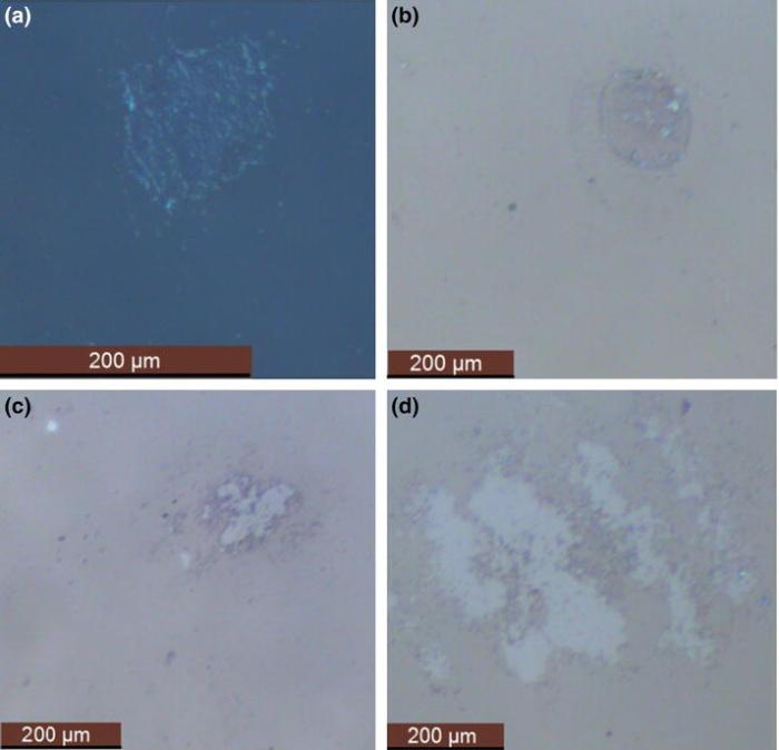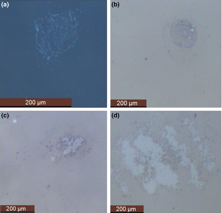 Fig. 6 Damage morphologies of MgF2 thin films annealed at different temperatures: a as-deposited, b 200 °C, c 300 °C, d 400 °C