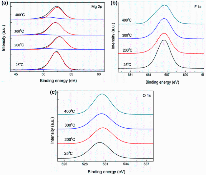 Furthermore, the F/Mg ratio of the as-deposited film was 1.7, lower than the bulk MgF2 stoichiometry, and the O/Mg ratio was close to 1. The same trend was observed by other authors on IBS MgF2 coatings and F/Mg ratio was 1.6 [12]. After annealing process, the F/Mg ratio decreased slightly, leading to the weak shift of the peak. The results suggested that H2O contaminant did not exist in the MgF2 films, and the mainly contamination was MgO in the films which was induced by the residual oxygen during or after deposition. In addition, an oxygen content of about 3% was detected in the annealed MgF2 films at the as-deposited 200 and 300 °C. This suggested that MgF2 films were not oxidized after 200 and 300 °C annealing process. While for the 400 °C-annealed film, the oxygen content increased to 6.42%, which meant that Mg-F bonds breaking occurred during the high temperature annealing procedure, leading to the formation of MgO.