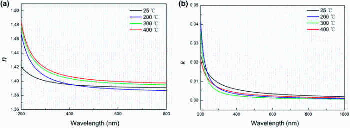 The wavelength dispersion of the refractive index, n, and extinction coefficient, k, of the MgF2 thin films annealed at different temperatures are shown in Fig. 4. A small increase was observed for the refractive index of the film after annealing process, which was due to the quicker molecule movement under higher temperature annealing process. As a result, the film gets more compact, leading to the higher refractive index. In addition, it was noted that the extinction coefficient of the films was very low and even close to zero, indicating a very small optical loss owing to the absorption in the region of 200-800 nm. It can also be seen that the extinction coefficient decreased slightly for the annealed films due to the densification of the films.