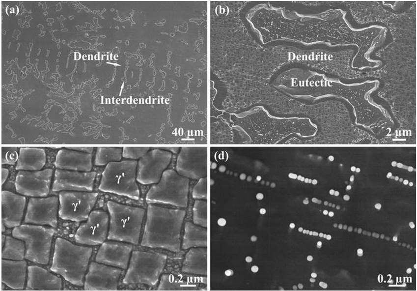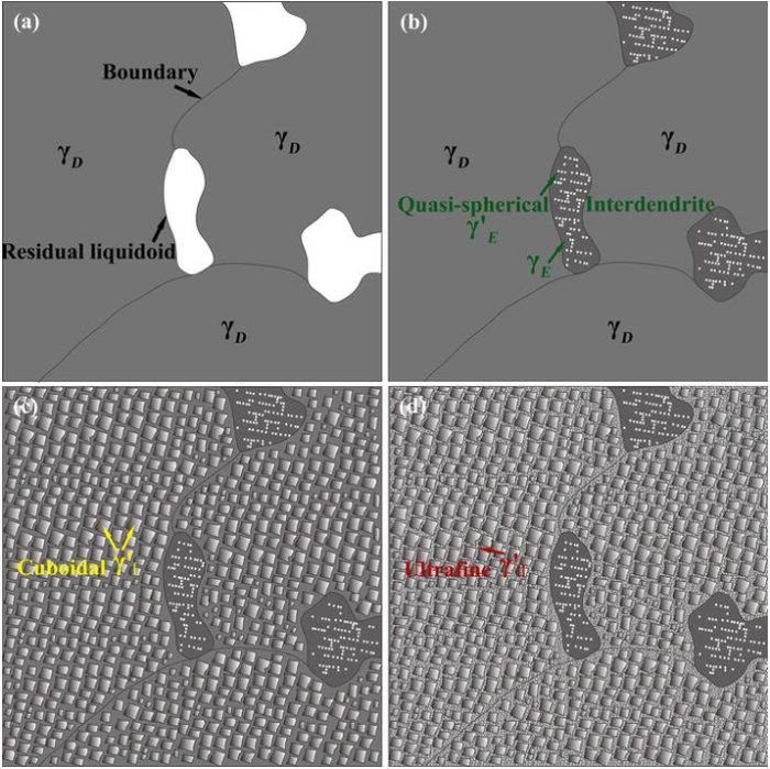 2. During solidification, the dendrite firstly generated from liquidoid near 1348 °C; subsequently, the residual liquidoid will be transformed into interdendritic phases around 1326 °C. Afterward, γ′ phase will precipitate from dendritic γ-matrix with two-stage characteristics, resulting in the distinct precipitation of γ′I and γ′II phases when approaching to 1190 and 1043 °C, respectively.