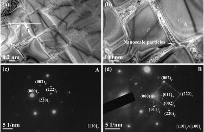To analyze the crystal structure of the nanoscale particles, the SAD patterns are acquired. Figure 3c shows the corresponding SAD patterns in the zone axis parallel to [110]γ′ for the marked A area in Fig. 3b, which obviously proves its L12 structure of the cuboidal γ′ phase [31]. As for the corresponding SAD patterns for the marked B area, Fig. 3d reveals two disparate types of crystal structure corresponded to γ phase and γ′ phase, respectively. Hence, it can be inferred that there is γ′ phase within the γ-channel between cuboidal γ′ precipitates, and the ultrafine nanoscale particles can be determined as a diverse kind of γ′ phase. It can be concluded that the dendrite is composed of quasi-cuboidal γ′ precipitates connected by γ-channels where ultrafine γ′ particles are distributed, so the dendrite can be defined as γ′ + γ dendrite.