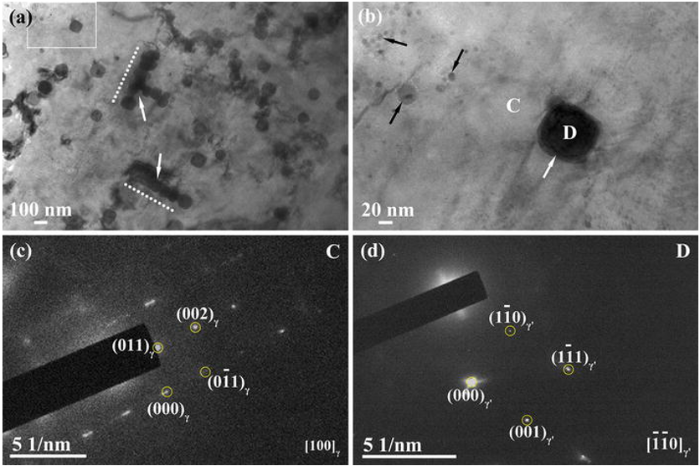 From the SEM morphology of Fig. 2d, a number of quasi-spherical particles are observed within the eutectic structure, i.e., interdendritic region. To precisely determine its morphology and crystal structure, TEM observations associated with SAD patterns were conducted and are shown in Fig. 4. In the bright-field image of the eutectic structure shown in Fig. 4a, a number of coherent quasi-spherical particles are observed, which is counted to be about 60 nm in mean diameter indicated by the arrows. Moreover, the particles tend to exist in linear arrays, as marked by the dotted line, consistent with the morphology in Fig. 2d. In the magnified image of Fig. 4b, its quasi-spherical morphology can be seen more clearly; in addition, some tiny particles are discovered unexpectedly, as indicated by the black arrows. The tiny particles are supposed to precipitate from the supersaturated γ phase during the solidification process. Figure 4c shows the SAD patterns for the selected C area in Fig. 4b, which reveals its γ phase characteristic. Otherwise, the SAD patterns for the D particle prove the quasi-spherical particles to be γ′ phase. Therefore, the interdendrite is characterized as γ′-γ eutectic structure comprising γ phase and dotted quasi-spherical γ′ particles.