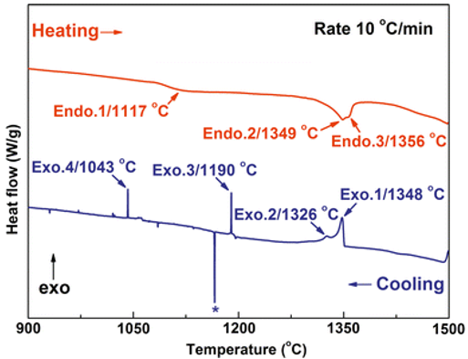 For the subsequent cooling process from 1500 °C (i.e., the solidification process), it exhibited four apparent exothermic peaks. An exothermic peak (Exo.1) firstly arises around the temperature of 1348 °C, and the exothermic peak can be identified as the peak temperature for γ phase nucleation from liquidoid. Compared to the heating process, the peak nucleation point for γ phase (1348 °C) is slightly lower than its peak melting point (1356 °C). Afterward, a second exothermic peak (Exo.2) arises when cooled to around 1326 °C, which corresponds to the peak temperature for the generation of γ′-γ eutectic structure from residual liquidoid. Then, a distinct exothermic peak (Exo.3) emerges around 1190 °C, based on the above TEM results; it can be inferred to the peak temperature for the cuboidal γ′ phase precipitation (Figs. 2c, 3a) from γ phase, which can be defined as γ′I. At last, the fourth exothermic peak (Exo.4) appears around 1043 °C. Due to the results presented in Fig. 3, nanoscale γ′ particles are dispersedly distributed within the γ-phase channels between two cuboidal γ′I precipitates, which can be regarded to precipitate behind γ′I. Herein, the nanoscale γ′ particles are defined as γ′II, and the exothermic peak around 1043 °C can be explained as the peak temperature for the precipitation of γ′II phase. Besides, an obvious endothermic peak appears around 1166 °C, as marked by the asterisk on the cooling curve, which is unknown and needs further confirmation.