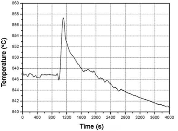 Figure 2 shows the typical time-temperature curve at the interface during reaction. The K2ZrF6 addition (at about 1000 s) leads to an abrupt temperature increase (a 12 °C increment relative to the case without addition of the K2ZrF6) due to the exothermic reaction. Afterward, the temperature decreased slowly due to the net heat loss to the surroundings.