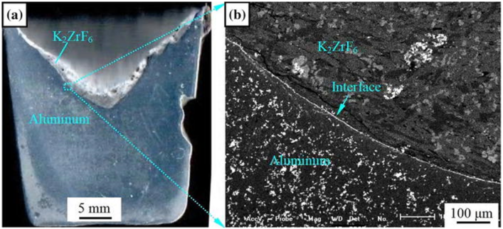 Fig. 3 Interface between the K2ZrF6 and aluminum: a macrostructure, b magnified BSE image