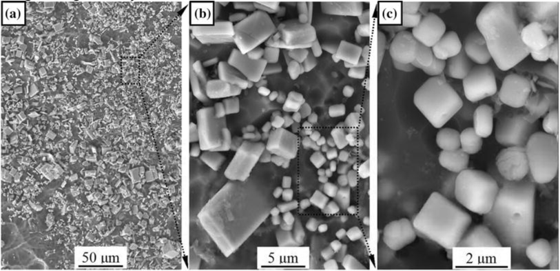 The sample was cut in half lengthwise and then mechanically polished for macro- and microstructure observations. Afterward, salt was removed and the interface of aluminum side was observed by scanning electron microscopy (SEM) directly. Energy dispersive spectroscopy (EDS) was employed to identify the composition of the particle at the interface. Deep etching by a solution of 25 wt%, NaOH was employed to reveal the three-dimensional morphology of the initial particle on the interface.