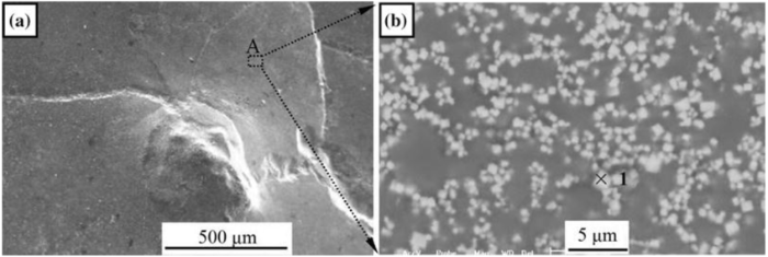 Fig. 4 Exposed interface on the aluminum: a typical interface morphology on the aluminum size, b BSE image of the A region in a