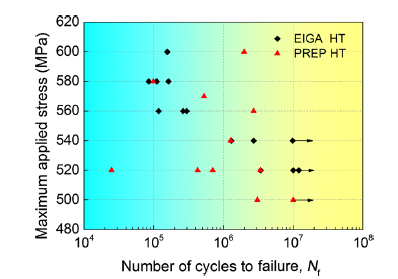 In the present study, the fatigue strength is not available. Previous studies reported that the fatigue endurance limit (at 107 cycles) of the as-HIPed PREP samples is in the range of 350-450 MPa [7, 27], which is much lower than that of EIGA samples.