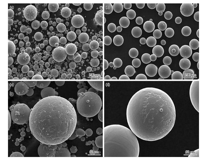 Fig. 3 Ti-6Al-4V powder surfaces: a EIGA, b PREP, c, d are higher magnifications of a, b