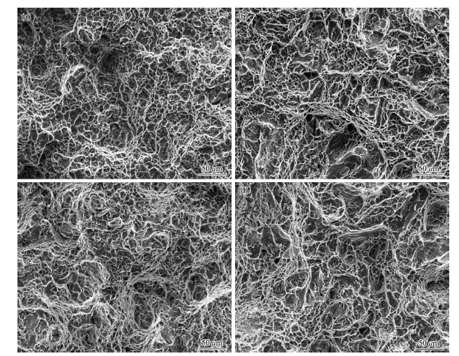 Fig. 9 Tensile fracture surfaces of Ti-6Al-4V alloy: a as-HIPed EIGA, b heat-treated EIGA, c as-HIPed PREP, d heat-treated PREP specimens