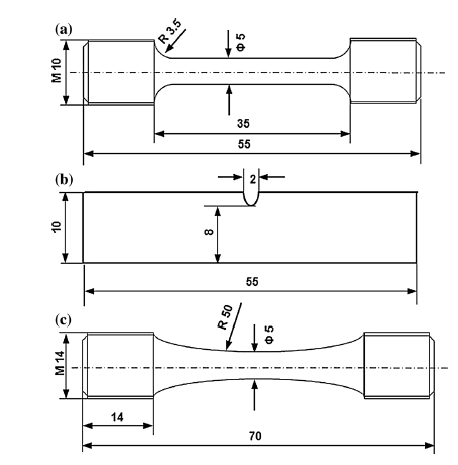 Fig. 1 Geometries and dimensions of specimens for a tensile, b impact, c high-cycle fatigue tests