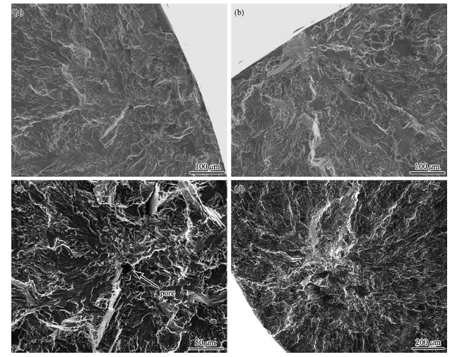 Fig. 11 Fatigue fracture surface of heat-treated PREP Ti-6Al-4V samples: aσmax = 520 MPa, Nf = 3,374,525, bσmax = 560 MPa, Nf = 2,695,330, cσmax = 520 MPa, Nf = 427,160, dσmax = 600 MPa, Nf = 1,977,904