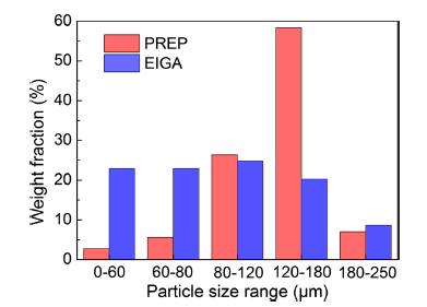 (1)EIGA powder has a finer average powder size and higher tap density, while the PREP powder has better flowability and less porosity.