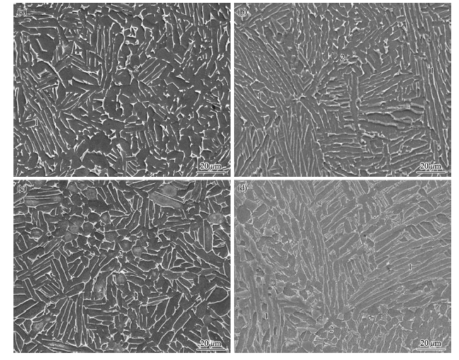 Fig. 7 Microstructure for Ti-6Al-4V powder compacts: a as-HIPed EIGA, b as-HIPed PREP, c heat-treated EIGA, d heat-treated PREP samples. 1 Lamellar α grain gathered in colonies; 2 nodular α grain