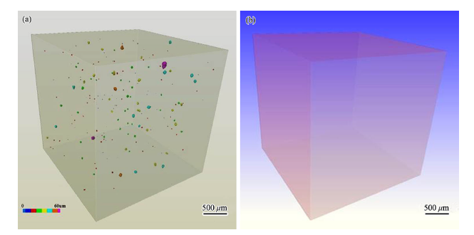 Figure 8 shows the pore distribution of heat-treated EIGA and PREP powder compacts measured by a Micro-CT. The pores with different normalized pore size were colored to increase the contrast with the blue matrix. The reconstructed volume was approximately 1.8 mm × 1.8 mm × 1.8 mm. The pore volume fraction of heat-treated EIGA powder compacts calculated by tomographic analysis is only ~0.02%, which cannot be detected by the Archimedes method. However, no pores with size more than 4 μm could be found in heat-treated PREP specimens (Fig. 8b).