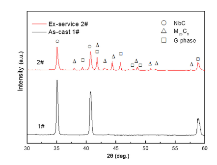 1.The as-cast microstructure of 20Cr32Ni1Nb steel typically consists of a supersaturated solid solution of austenite matrix with eutectic-like primary niobium-rich carbides (NbC) and chromium-rich carbides (M23C6). Compared with the microstructure of the as-cast specimen, large amounts of secondary carbides precipitate within austenite matrix. In addition, the transformation of NbC carbide into G-phase takes place during service exposure.