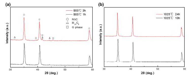 A series of isothermal aging treatments were performed for 1-24 h in the temperature range of 800-1100 °C. In order to identify the precipitates in the as-cast and ex-service 20Cr32Ni1Nb steels, and detect the phases in the aged specimens, the precipitates were extracted from the matrix using Piekarski’s method [17]. The electrolyte was a mix solution of 5% hydrochloric acid and 5 × 10-3 g/cm3 of citric acid. The electrolysis current density was 5 mA/cm2, and the electrolysis time was 18 h. Then, the extracted residues were identified using RigakuSmartLab diffractometer with a CuKα (λ = 0.154056 nm) at 40 kV and 30 mA from 30° to 60° with a step size of 0.02°.