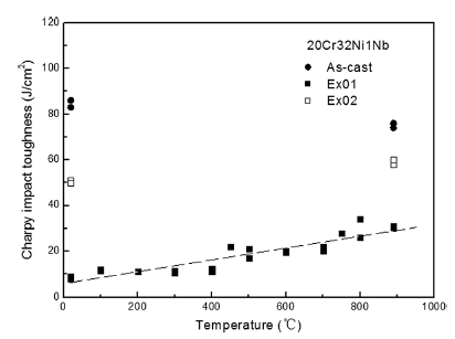 Fig. 11 Charpy impact toughness values of the as-cast and ex-service 20Cr32Ni1Nb steels at different temperatures