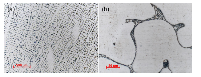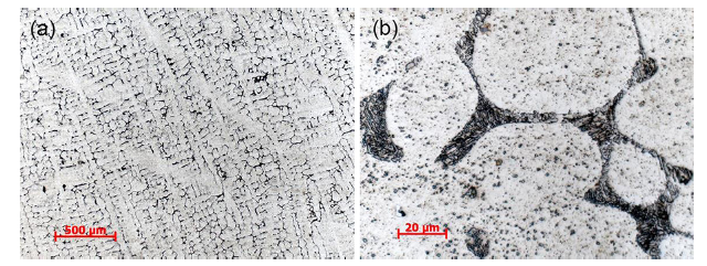 Fig. 2 Optical microstructures of the as-cast 20Cr32Ni1Nb steel at different magnifications