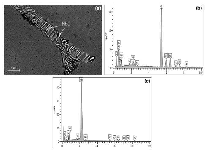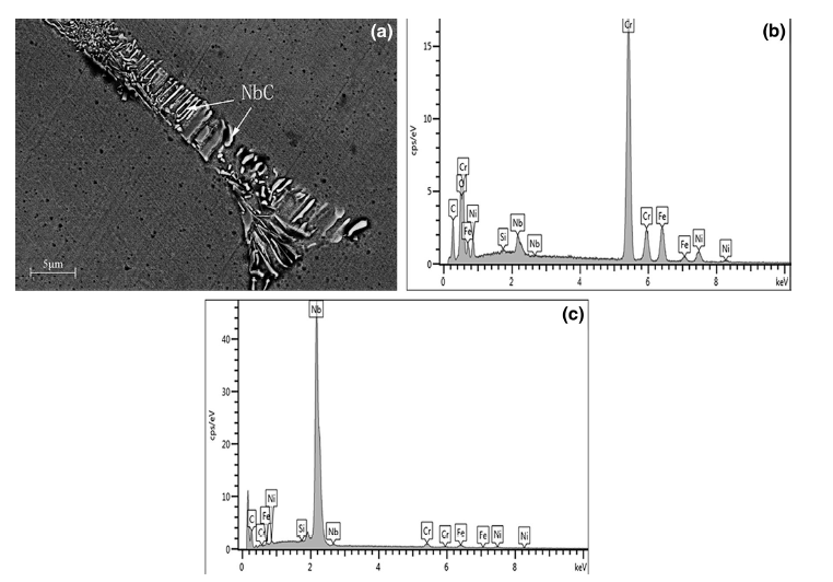 Fig. 3 Typical back-scattered electron (BSE)-SEM images of 20Cr32Ni1Nb steel in the as-cast condition: adark contrast corresponds to M23C6 and bright contrast to NbC carbides; b, c are the typical EDS analyses of M23C6 and NbC
