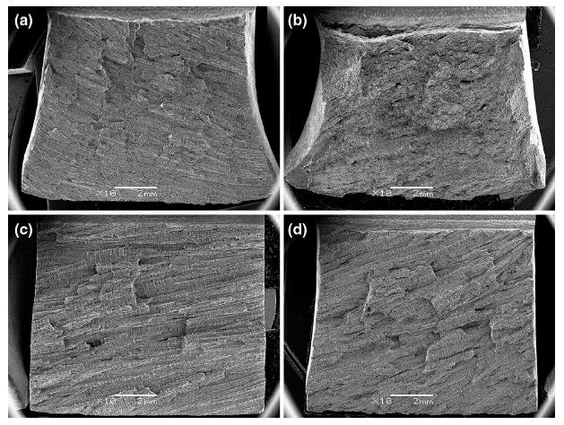 Fig. 12 SEM micrographs of the fracture surface of: a the as-cast sample tested at ambient temperature; b the as-cast sample tested at 890 °C; c the sample Ex01 tested at ambient temperature; d the sample Ex01 tested at 890 °C