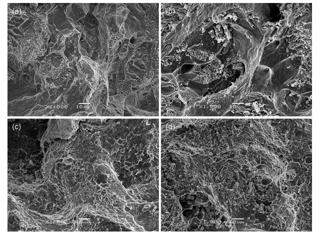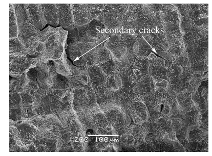 Figures 12-14 exhibit SEM fractographs of the Charpy impact samples in the as-cast and ex-service condition. As shown in Fig. 12, the fracture surfaces of the as-cast specimen show the significant macroscopic plastic deformation, compared with that of the sample Ex01. This phenomenon is consistent with the result that the Charpy impact value in the as-cast condition and is obviously higher than that in the service state, as shown in Figs. 11. Figure 13 presents the typical SEM fractograph of the Charpy impact sample Ex01 tested at room temperature. Note from Fig. 13, some secondary cracks are observed in the fractographs, which may be responsible for the sharp loss of the Charpy absorbed energy. In order to investigate the fracture mode in the two materials, the high magnification SEM fractographs are shown in Fig. 14. In Fig. 14, significant differences can be observed in the fractographs. Compared with the sample Ex01, the average size of the dimple on the fracture surface is obviously larger, and the depth of the dimple is significantly deeper in the as-cast samples. As is well known, the size and depth of the dimple are strongly dependent on the size and the distribution of the precipitates in the materials. In the present study, owing to the formation of G-phase at the dendrite boundaries during the service exposure, this factor may be attributed to the sharp decrease of the Charpy impact absorbed energy in the ex-service specimens.