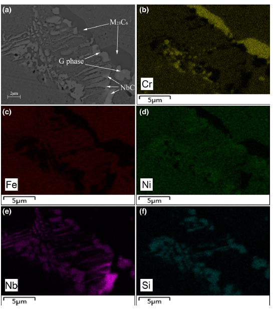 5.The degradation of the mechanical properties of the 20Cr32Ni1Nb steel may be mainly attributed to the loss of particle hardening due to the continuous growth and coarsening of NbC and M23C6 carbides together with the transformation of NbC carbide into G-phase at the dendrite boundaries during service exposure. In addition, the formation of G-phase during plays a key role in the degradation of the mechanical properties of the steel.