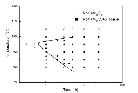 3.TTT curve of 20Cr32Ni1Nb steel determined from X-ray diffraction data. The nose temperature of G-phase formation is about 950 °C, but this phase is not detected after aging at 1025 °C, which indicates that G-phase may be only stable below 1000 °C.