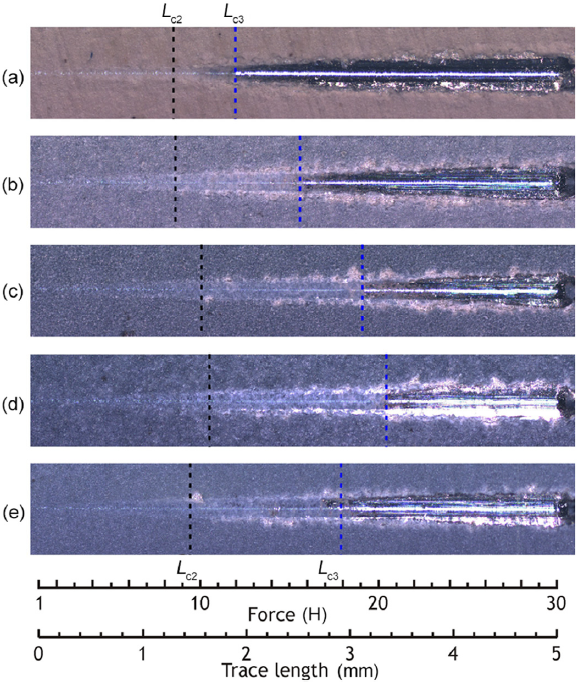 Adhesion properties of surface layers were studied by scratch testing, using a Revetest Scratch Tester (CSM Instruments, Switzerland). The experiments were carried out at a preset track length of 5 mm selected empirically and an even load increase from 1 up to 30 N at a rate of 10 N min-1. For scratch testing, a Rockwell diamond indenter was used. The following parameters were determined for each type of coatings: