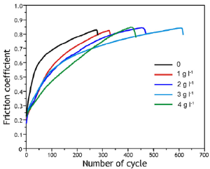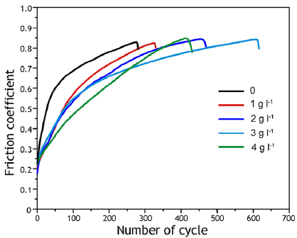 Fig. 10 shows the data of tribological tests as dependence of the friction coefficient (μ) on the number of cycles. In general, one observes the preservation of the trend of a positive effect of titanium nitride nanoparticles incorporated into coatings on their mechanical properties (