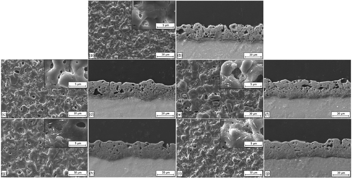 Fig. 2. SEM images of surfaces (a, c, e, g, i) and cross-sections (b, d, f, h, j) of coatings obtained in silicate-fluoride electrolyte without (a, b) and with TiN nanoparticle concentration of 1 g l-1 (c, d), 2 g l-1 (e, f), 3 g l-1 (g, h) and 4 g l-1 (i, j) (The arrows show the particle agglomerates on the coating surface).