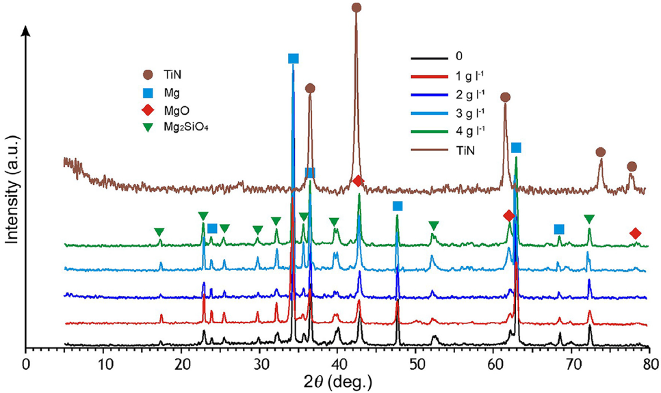 Table 2 Element compositions (wt%) of PEO coatings in silicate-fluroide electrolytes with different concentrations of TiN nanoparticles.
