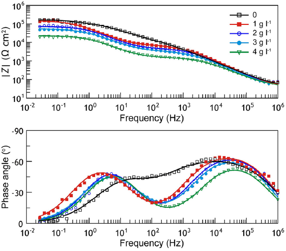 Fig. 7. Bode diagrams of PEO coatings on Mg alloy MA8 in silicate-fluoride electrolyte without and with different concentrations of TiN nanoparticles. (Symbols are the experimental data, while the solid lines are fitting curves).