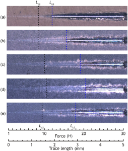 The external appearance of the scratch made to reveal the mechanism of the coating destruction is shown in