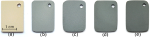 Fig. 1. Optical images of Mg alloy MA8 samples with PEO coatings formed in silicate-fluoride electrolyte without (a) and with TiN nanoparticle concentrations of 1 g l-1 (b), 2 g l-1 (c), 3 g l-1 (d) and 4 g l-1 (e).
