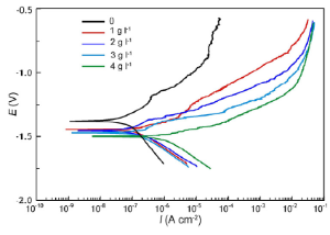 Electrochemical properties of the surface layers formed on Mg alloy MA8 were studied through potentiodynamic polarization and electrochemical impedance spectroscopy (EIS). Measurements were performed using a VersaSTAT MC device (Princeton Applied Research, USA). 3% aqueous solution of NaCl was used as electrolyte. Working area was set as 1 cm2. To attain the electrochemical equilibrium, samples were stabilized in the electrolyte for 30 min. To perform EIS measurements, a sinusoidal signal with a 10 mV (rms) amplitude was used. Spectra were recorded at an open circuit potential in the range of 0.02 Hz-1 M Hz in logarithmic sweep 10 points per decade. During the EIS measurements, the free corrosion potential was stabilized potentiostatically (steady state conditions). The sweep rate of potentiodynamic measurements was equal to 1 mV s-1. Samples were polarized in anodic direction from the potential of