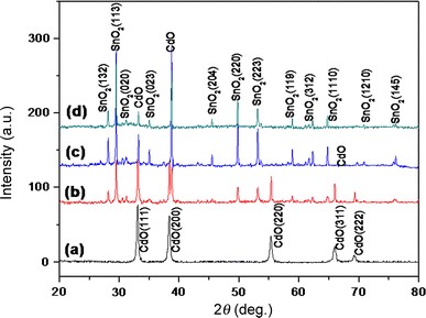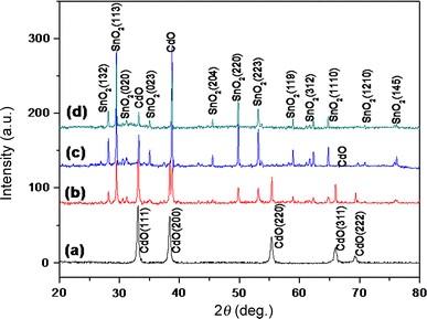 Figure 1 shows the XRD patterns of (1-x)CdO-xSnO2 nanocomposites. The results in Fig. 1a reveal the diffraction peaks at angles 33.01°, 38.26°, 55.30°, 65.87° and 69.22° corresponding to (111), (200), (220), (311) and (222) crystal planes, suggesting the formation of pure CdO nanostructures without any impurities and secondary phases, which is in good agreement with the values in the JCPDS file (75-0594). Pure CdO nanostructures exhibit good crystalline and face-centred cubic structure. Ravichandran et al. [22] also observed similar structural characteristics and phases of CdO nanostructures synthesized via chemical precipitation method. The crystalline size of CdO nanostructures with respect to high intense peaks for the crystal planes (111) and (200) was estimated using the Debey-Scherer’s equation [22]: