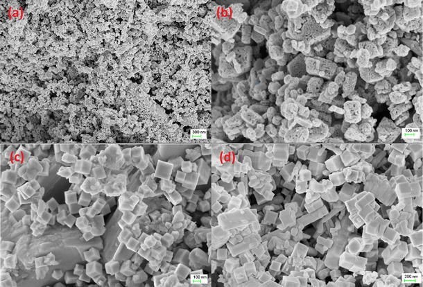Figure 2a shows the SEM image of pure CdO (x = 0) where the random distribution of the nanostructures having cubic shape with good separation can be clearly seen. Figure 2b shows the morphology of (1-x)CdO-xSnO2 nanocomposites (x = 0.05), revealing that the addition of SnO2 in CdO exhibits the agglomeration of small nanostructures of CdO and SnO2 with both cubic and orthorhombic types. Figure 2c, d shows the SEM images of the (1-x)CdO-xSnO2 nanocomposites (x = 0.10, 0.15) that clearly shows the formation of CdO-SnO2 nanocomposites with both cubic and orthorhombic structures. The SEM images in Fig. 2b-d confirm the formation of both cubic and orthorhombic structures corresponding to CdO and SnO2, respectively, in the prepared nanocomposites. The results are in good accordance with those obtained from XRD analysis. Therefore, the FESEM results confirm that CdO-SnO2 nanocomposites were successfully synthesized via a low-cost hydrothermal technique with both cubic and orthorhombic structures and good crystallinity at nanoscale.