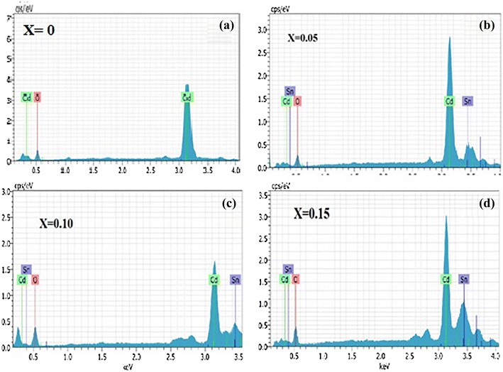 Fig. 3 EDS spectra of (1-x)CdO-xSnO2 nanocomposites for x = 0 a, x = 0.05 b, x = 0.10 c, x = 0.15 d