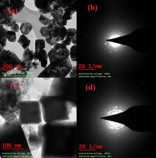 Fig. 4 HRTEM images a, c and SAED patterns b, d of (1-x)CdO-xSnO2 nanocomposites for a, b x = 0, c, d x = 0.10
